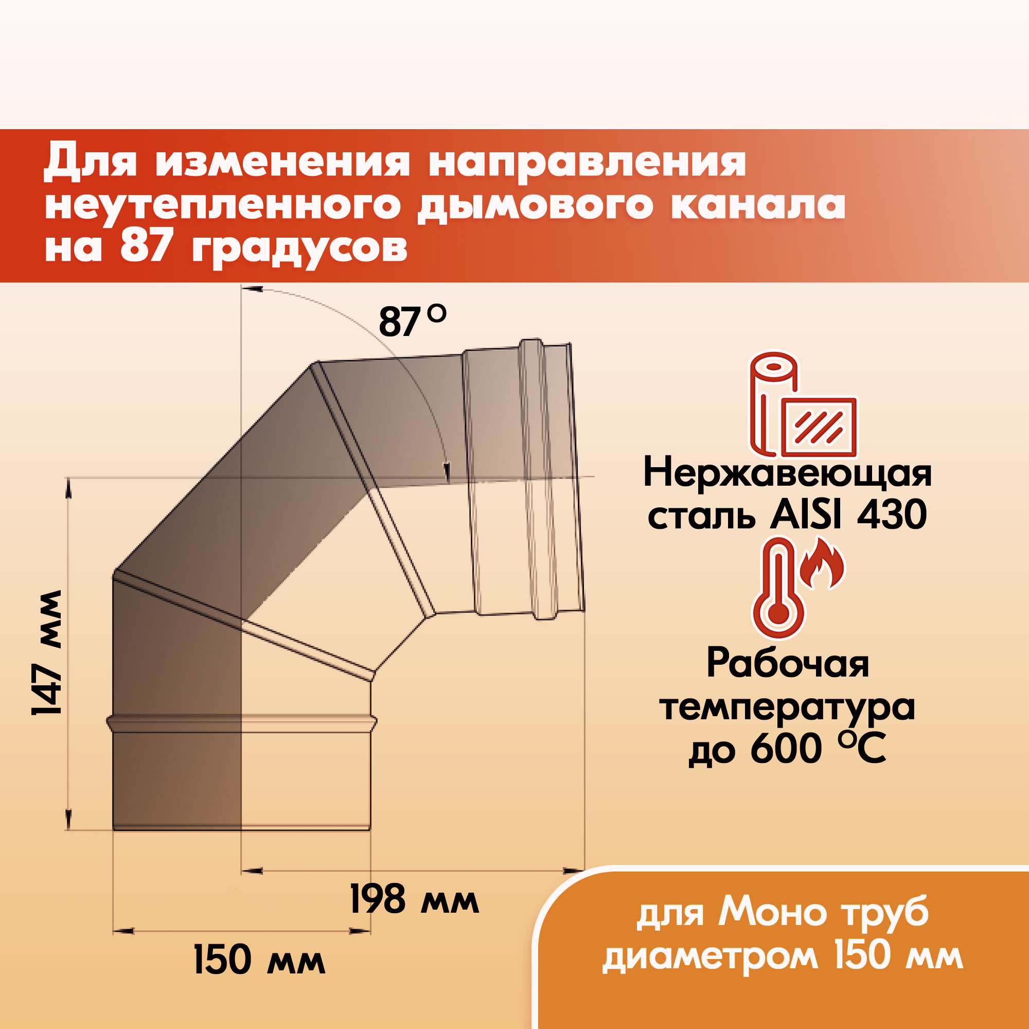 Отвод для дымохода Моно ОМ-Р от производственной компании Теплов и Сухов является элементом дымоходной системы и предназначен для изменения направления неутепленного дымового канала на 45 градусов или 87 градусов в зависимости от конфигурации.