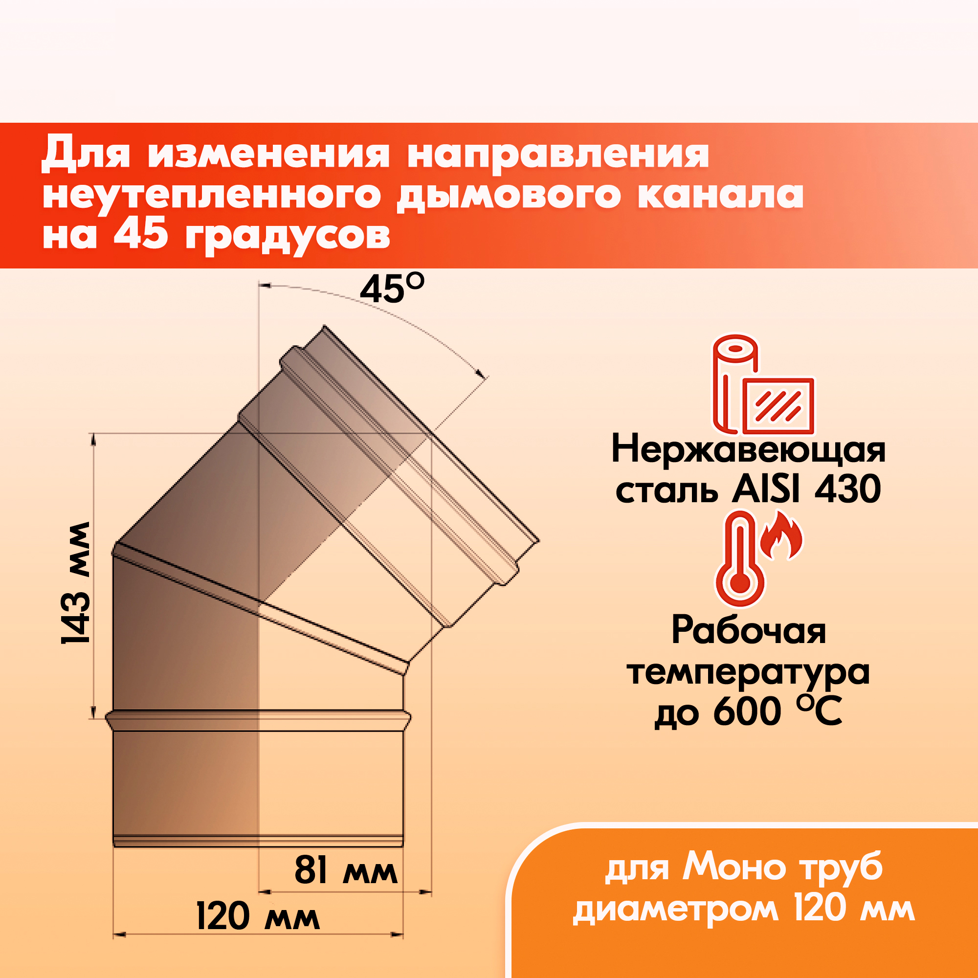 Колено дымохода Моно представляет собой одноконтурные цилиндрические секции из нержавеющей стали, соединенные шовной сваркой.