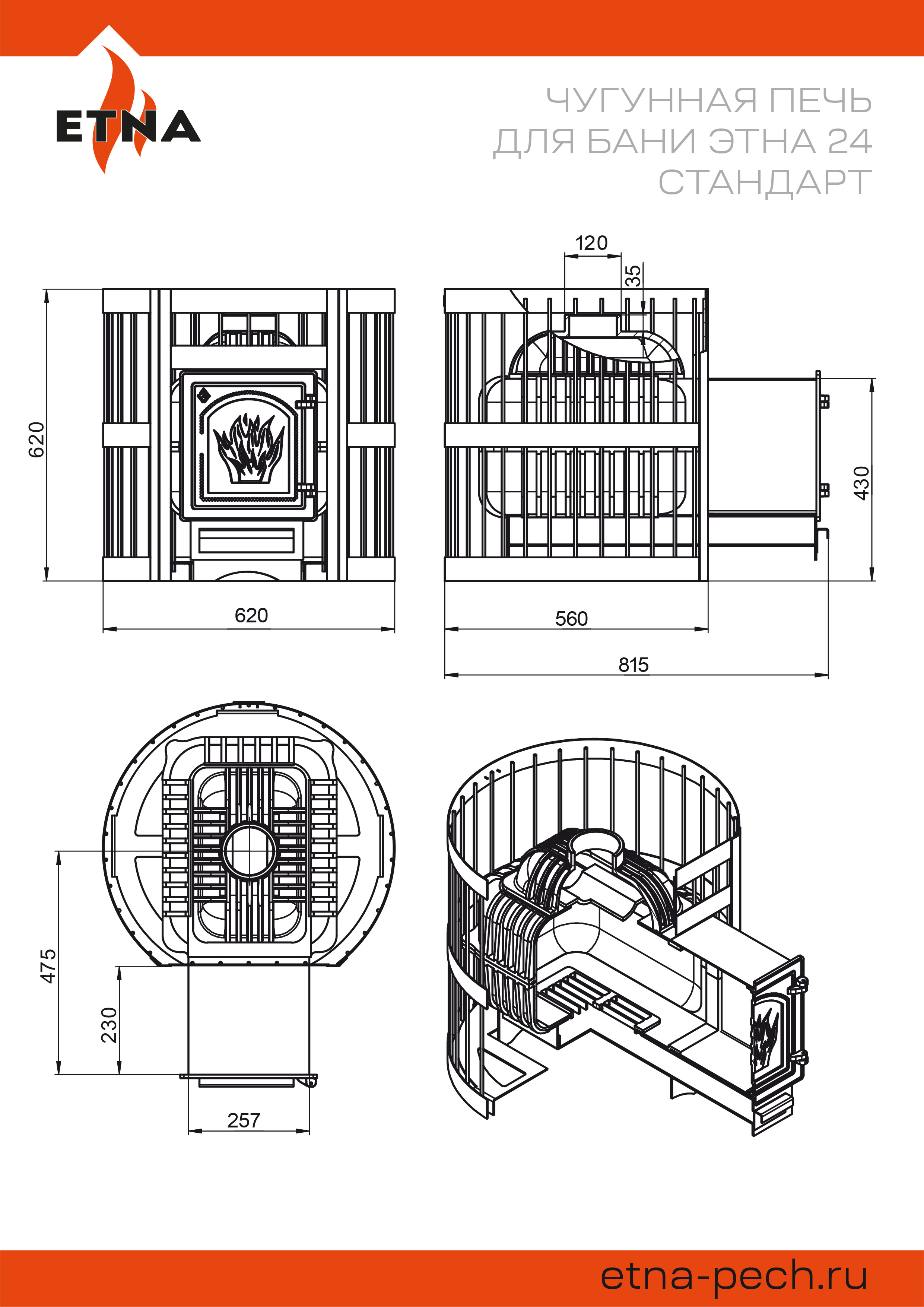 Чугунная банная печь ЭТНА 24 (ДТ-4) оснащается глухой чугунной дверкой ДТ-4 и рассчитана на работу в парной объёмом до 24 кубических метров. С помощью этой модели обеспечивается быстрый равномерный прогрев парной, поддержание необходимой температуры и получение достаточного количества пара.