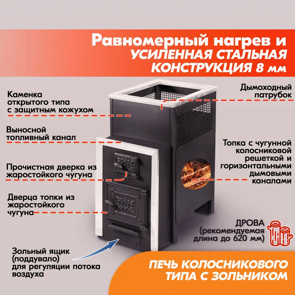 Сама по себе печь для бани Радуга ПБ-30Б колосникового типа с зольником.