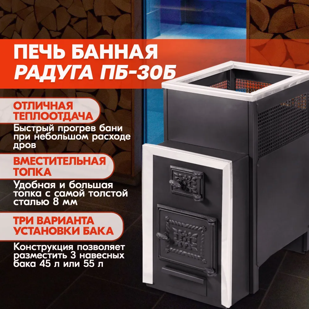 Банная печь Радуга ПБ-30Б (ПОД НАВЕСНОЙ БАК 45/55л) 8мм – прочная и долговечная конструкция с самой толстой сталью в серии.