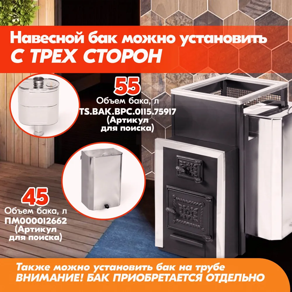 Съемный навесной бак закрепляется непосредственно на печи, что исключает необходимость приобретения соединительных трубопроводов и их монтаж.