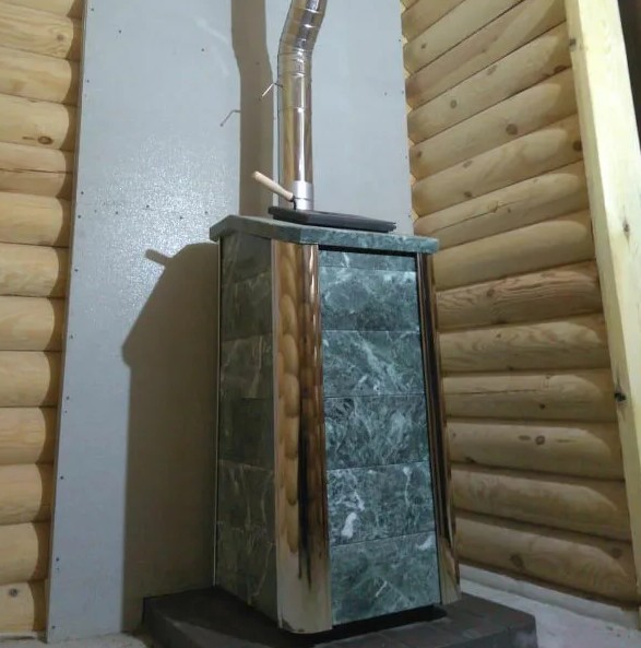 Печь ТЕРМА используется, в первую очередь, в банных помещениях. Она обладает привлекательным дизайном за счёт облицовки в змеевик. Этот материал хорошо отдаёт тепло, но, при этом, не нагревается сам. Также он позволяет создать равномерную температуру в помещении.