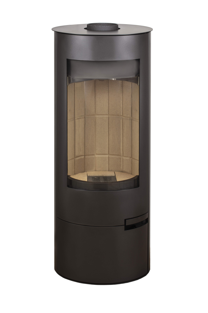 Пристенная высокая дизайнерская печь с панорамным обзором. Обзор огня с трех сторон. Оборудована большой остекленной дверкой выполненной в одной плоскости с корпусом печи и с двумя боковыми стеклами. Дверка высотой 600 мм и боковые стенки выполнены с небольшим радиальным изгибом. Ручка открывания утоплена внутрь дверки. Подсоединение к дымоходу сверху или сзади.