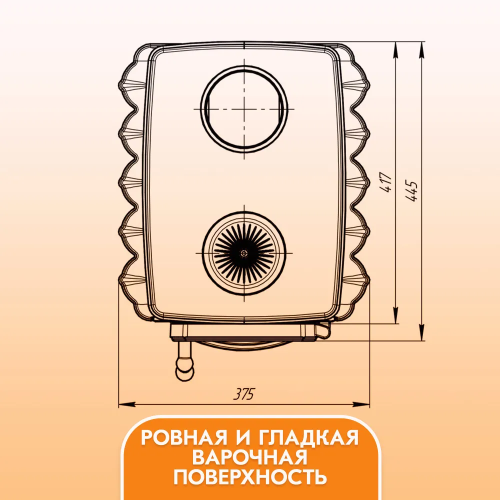 Боковые стенки конструкции металлической дровяной печи «Бахтинка» выполнены в форме радиаторов, увеличивающих общую площадь поверхности печи.